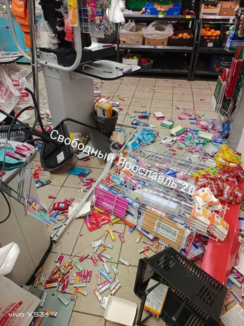 Разгромленное торговое помещение: опрокинутые стеллажи с товарами